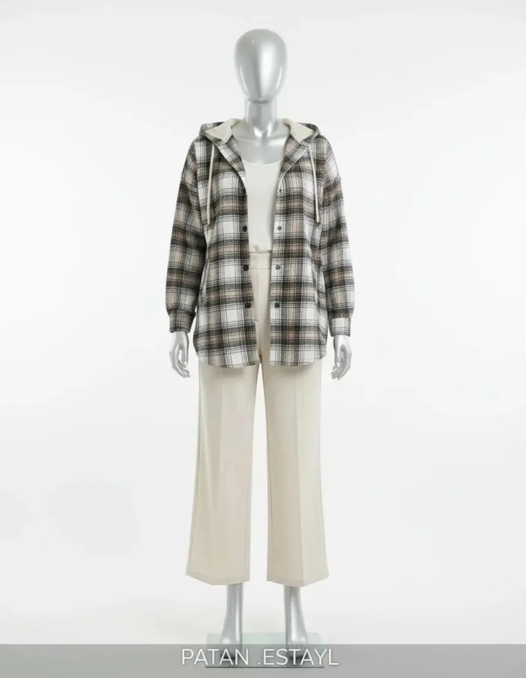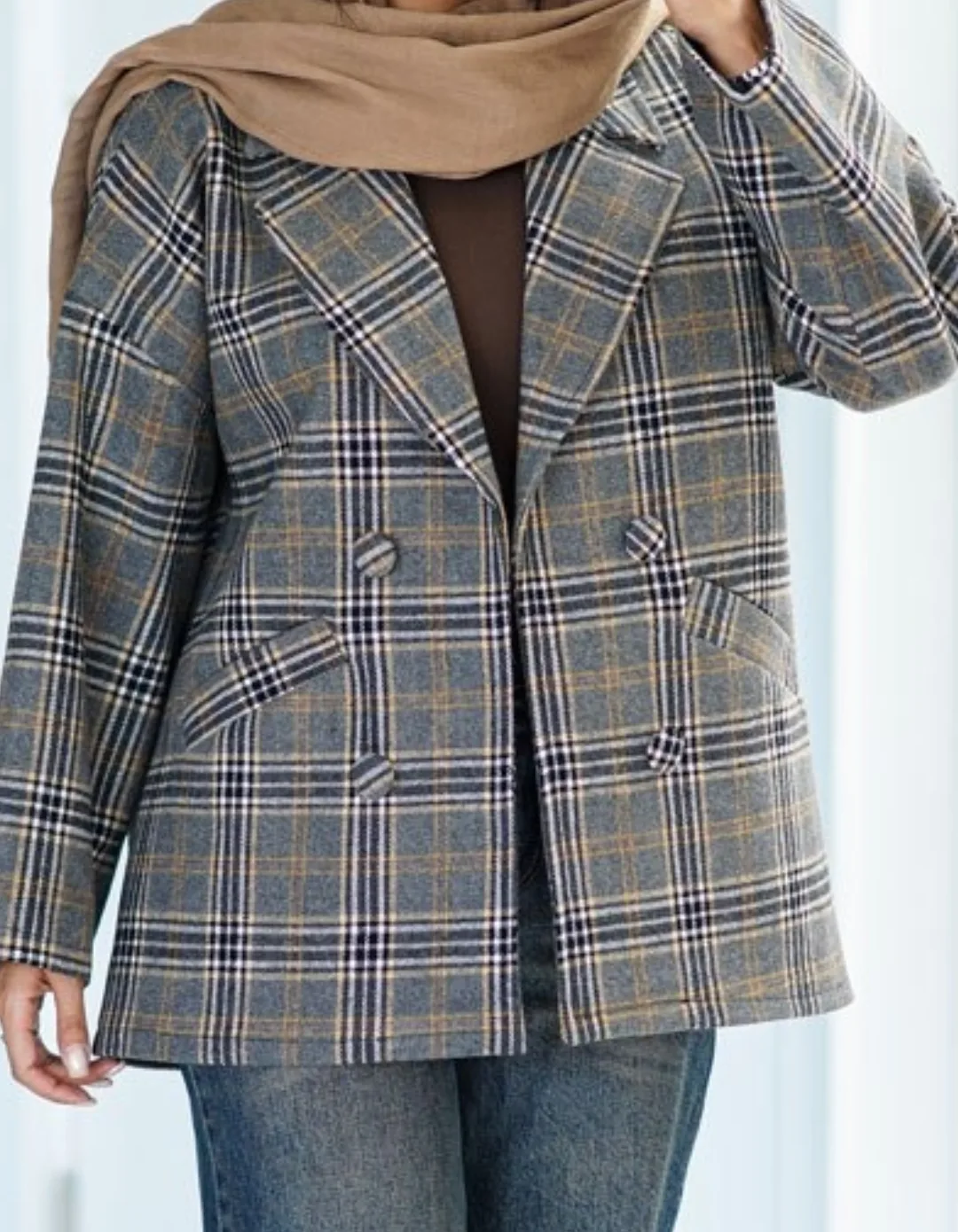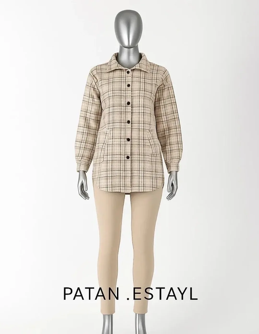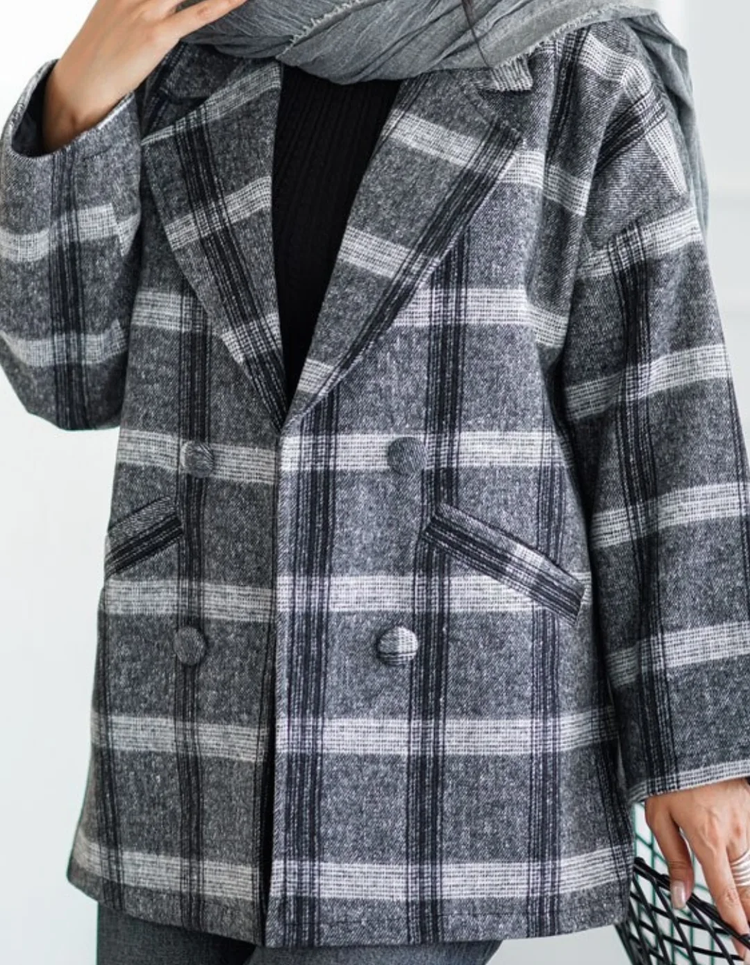 پالتو با رنگبندی ژورنال، مناسب برای سایز ۳۸ تا ۴۶. دور سینه ۱۲۰ سانتیمتر، جنس پارچه فوتر، مدل یقه انگلیسی، با جیب کاربردی و قد ۷۰ سانتیمتر. آستردار و دارای ۴ دکمه.