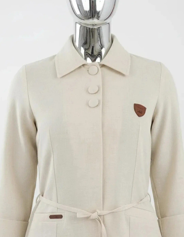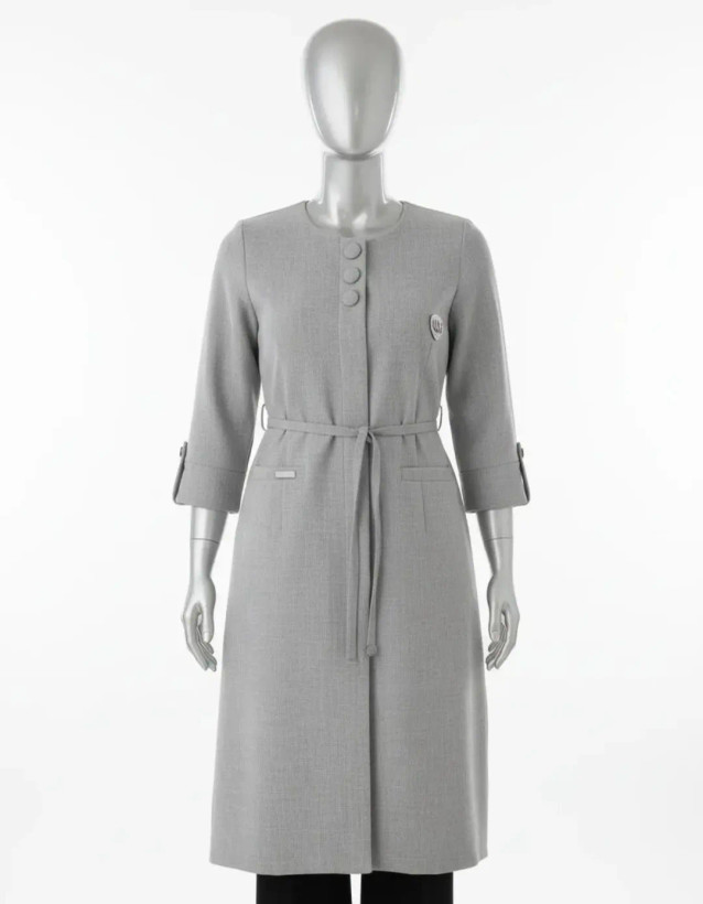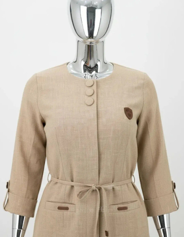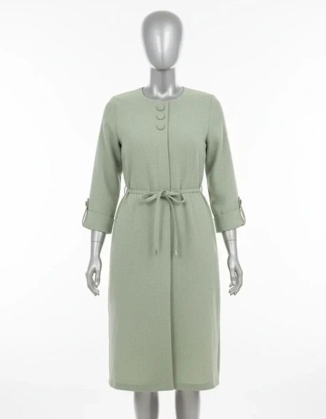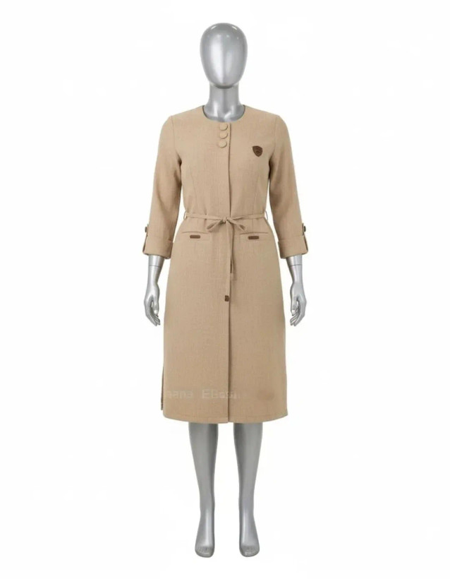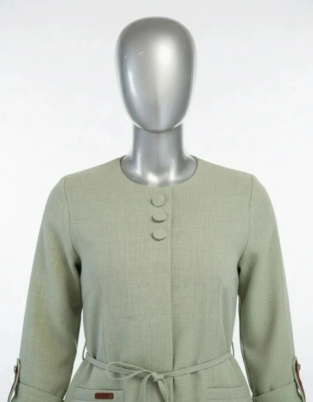 مانتوی شانتون با یقه گرد، آستین پاگون دار و جیب کاربردی. قد: ۱۰۷ سانتیمتر.