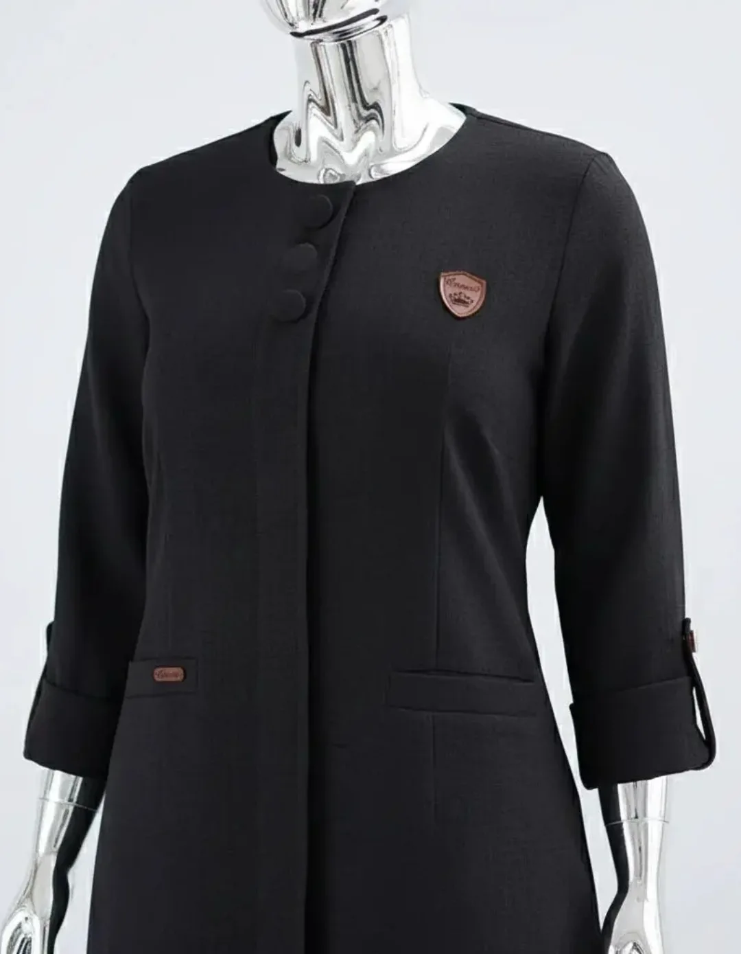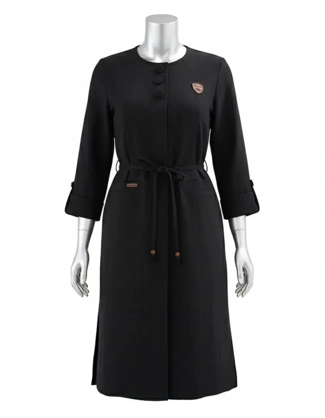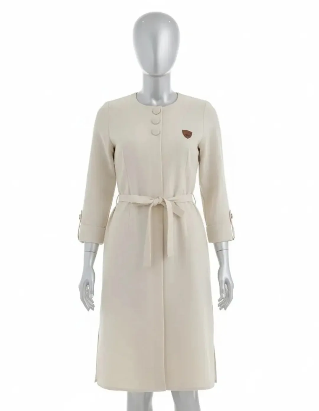 مانتوی شانتون با یقه گرد، آستین پاگون دار و جیب کاربردی. قد: ۱۰۷ سانتیمتر.