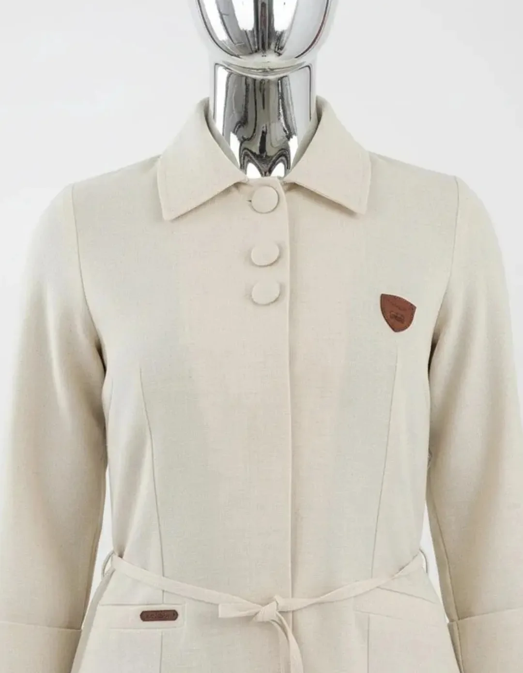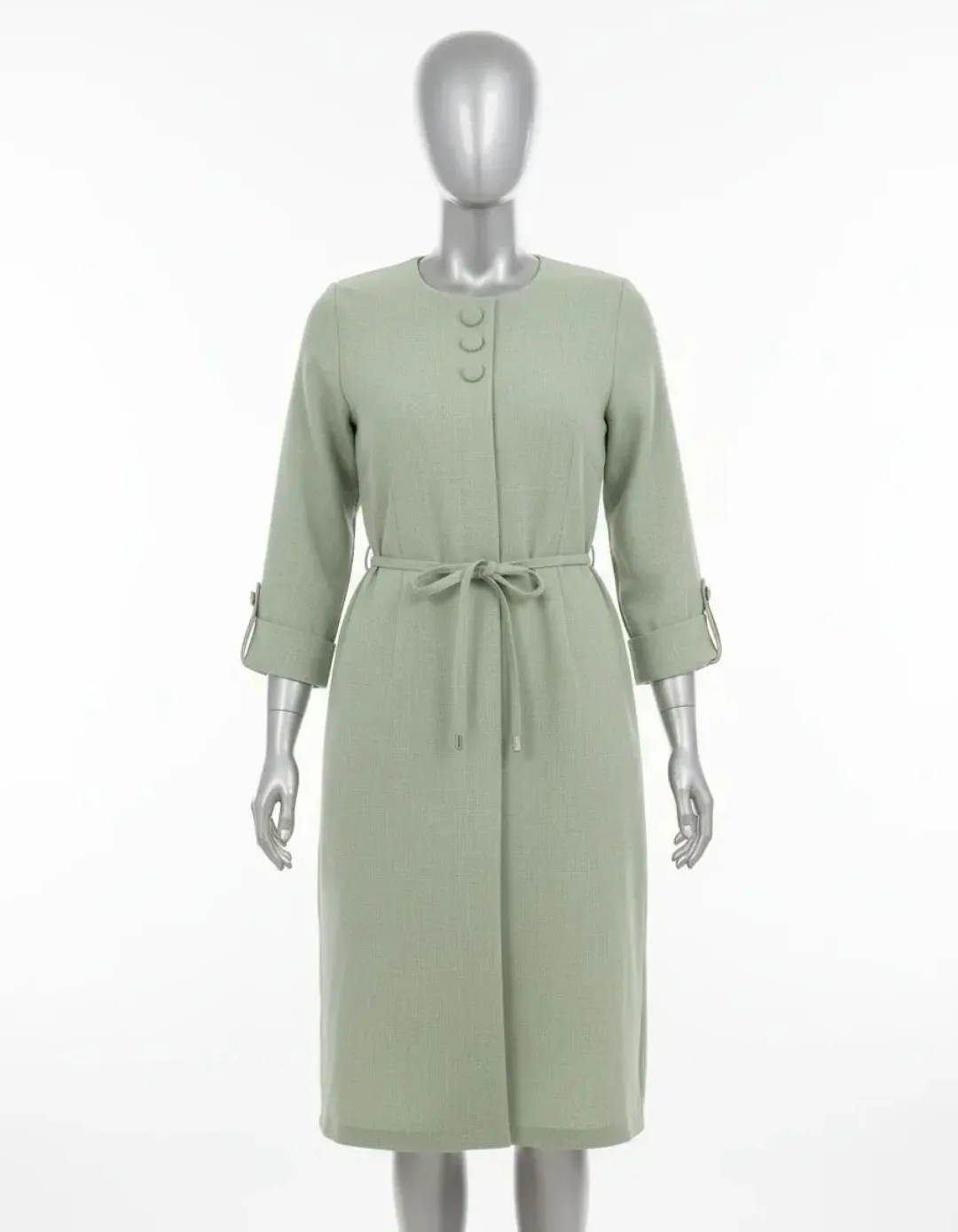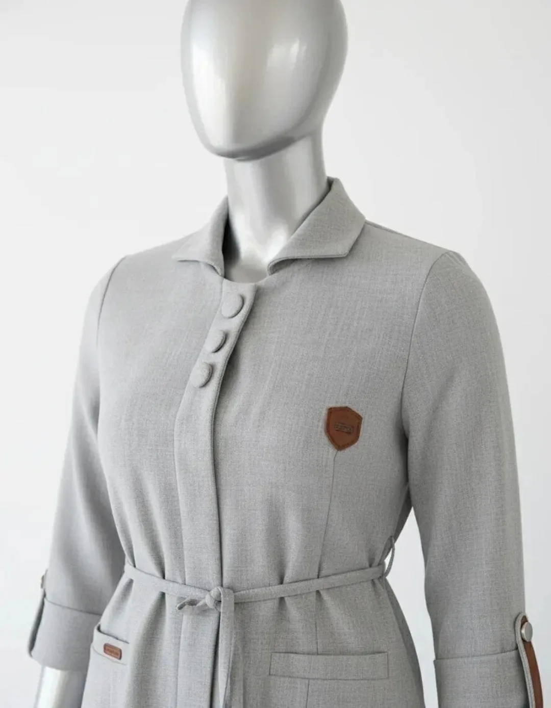مانتوی شانتون با یقه گرد، آستین پاگون دار و جیب کاربردی. قد: ۱۰۷ سانتیمتر.