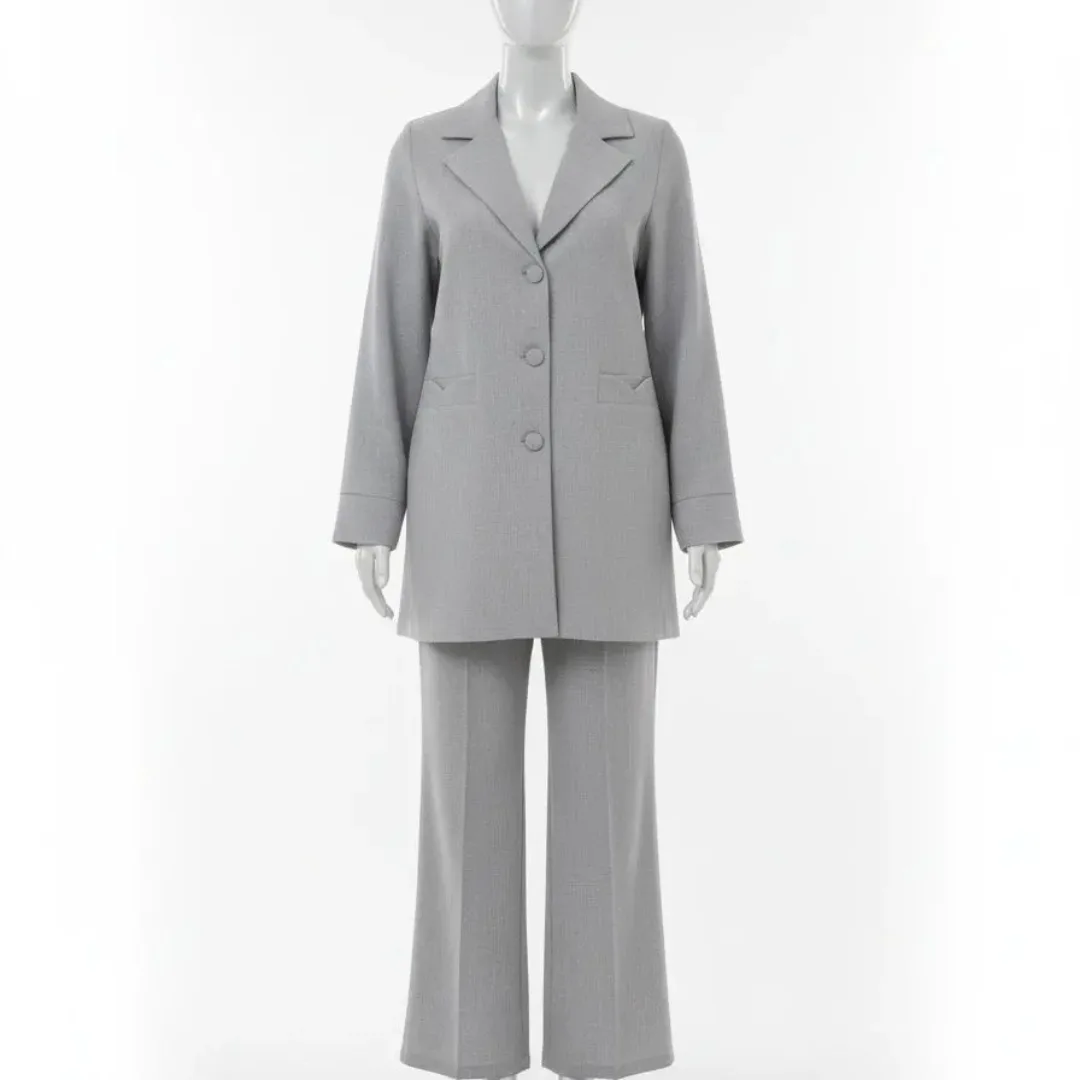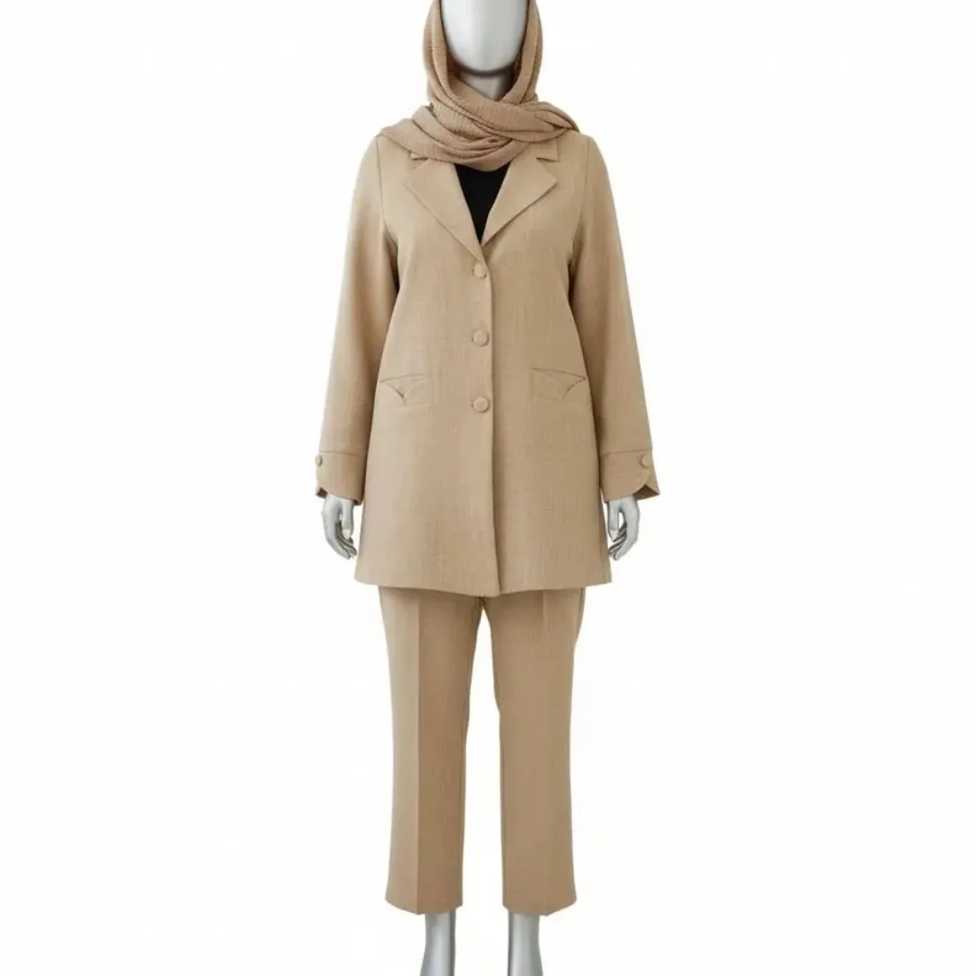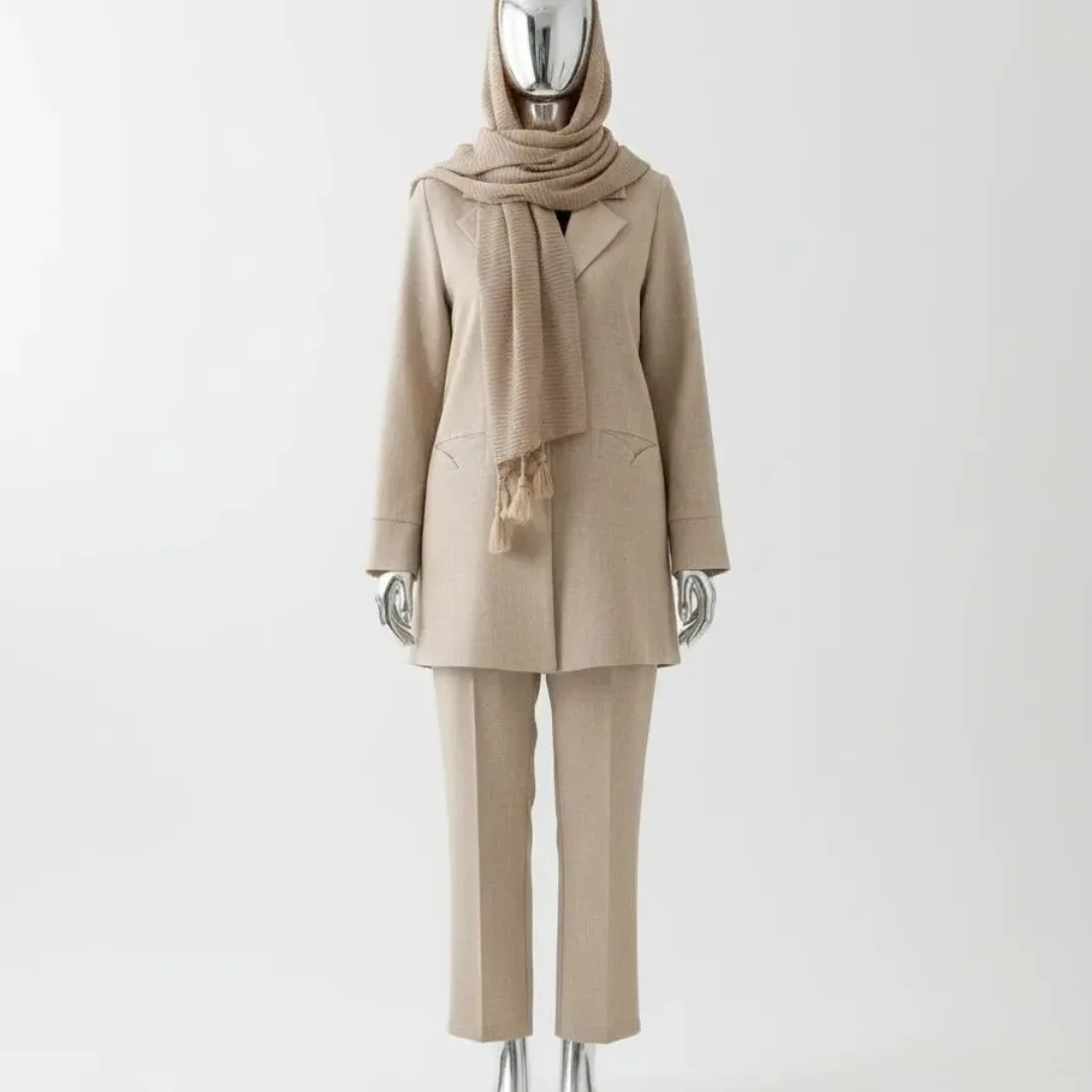 کت و شلوار مناسب مجالس خصوصی با رنگبندی ژورنال و جنس پارچه شانتون. مدل یقه انگلیسی با قد 80 برای کت و 107 برای شلوار.